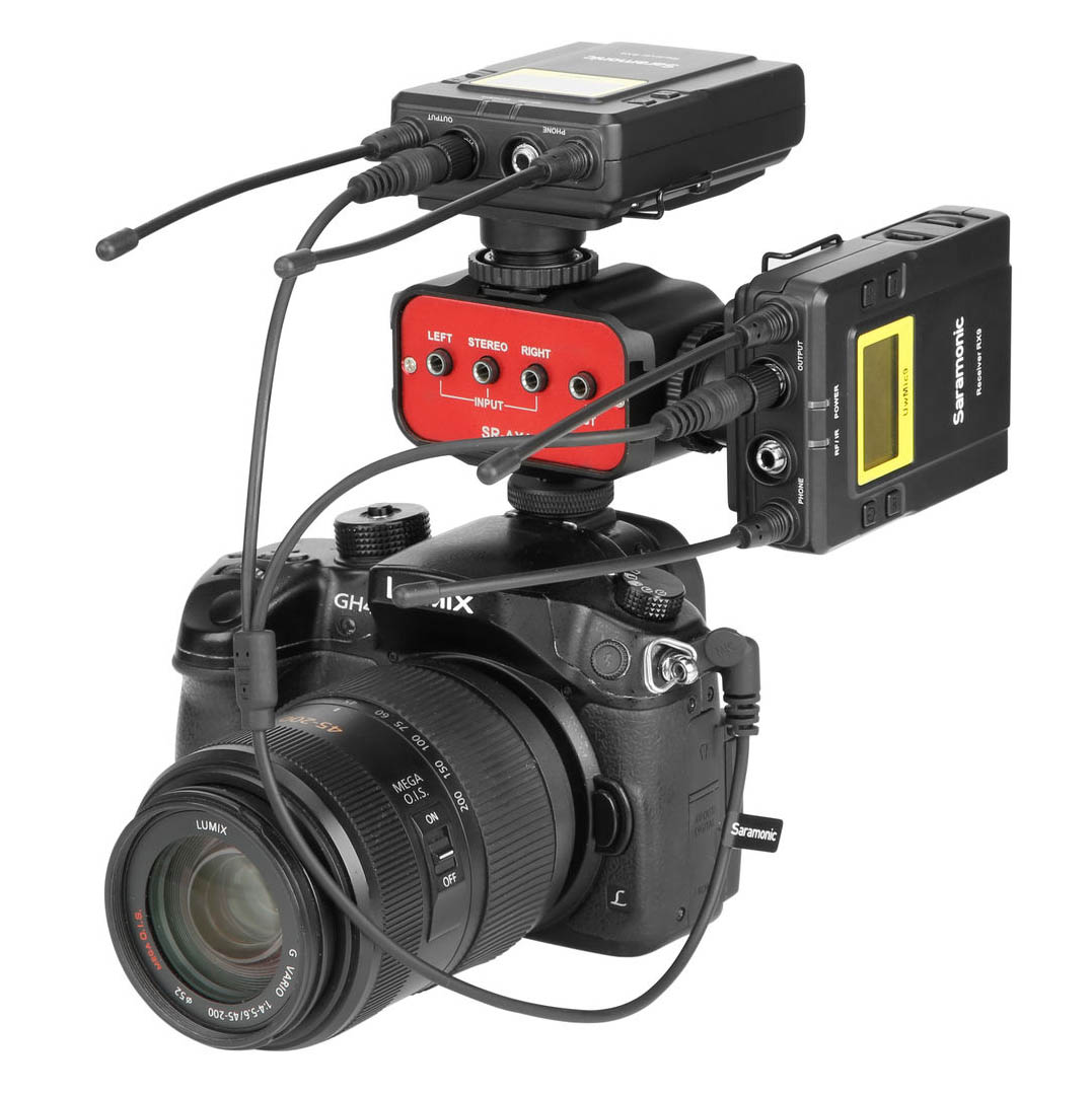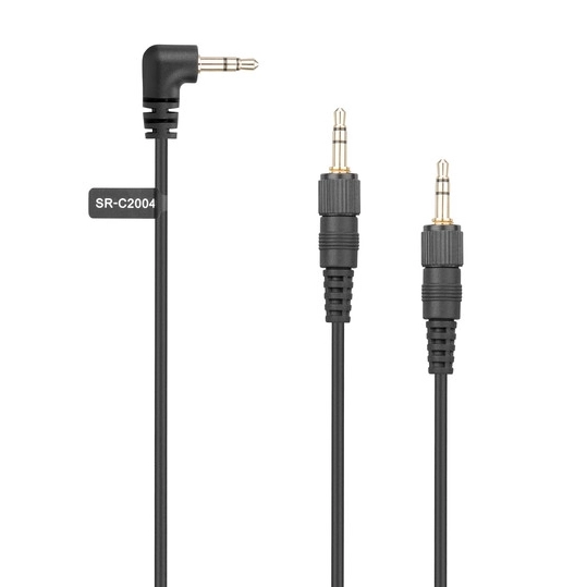 Cable Saramonic SR-C2004 dual en Y, con terminales de 3.5mm para conectar dos receptores inalámbricos a una cámara.