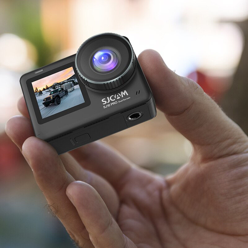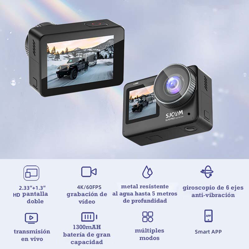 La SJ10PRO de doble pantalla es la nueva y mejorada cámara de acción insignia de SJCAM con 2 pantallas: una gran pantalla táctil IPS de alta definición de 2,33 pulgadas en la parte posterior y una pantalla HD de 1,3 pulgadas en la parte delantera para la grabación de selfies. Es capaz de grabar de forma nativa videos 4K sorprendentemente nítidos a 60 cuadros por segundo y es resistente al agua hasta 5 metros sin una carcasa resistente al agua.