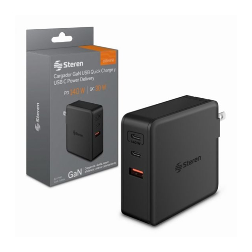 Cargador rápido triple Steren GaN, PD y QC, 140 watts (ELI-7140)