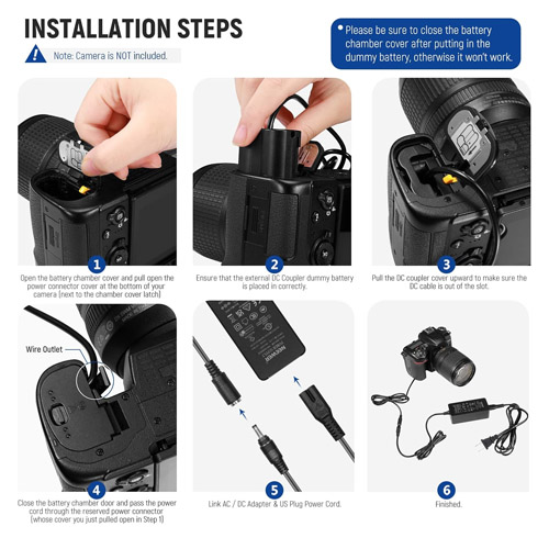 Este conjunto de alimentación es una fuente de energía alternativa diseñada para cámaras Nikon que utilizan baterías EN-EL15, incluyendo modelos como Z5, Z6, Z7, Z6II, Z7II, D500, D610, D750, D780, D800, D810, D850, D7000, D7100, D7200 y D7500. Incluye una batería hueca con acoplador y un adaptador de corriente, lo que permite mantener la cámara encendida durante largos periodos de grabación, sin preocuparse por el agotamiento de la batería.