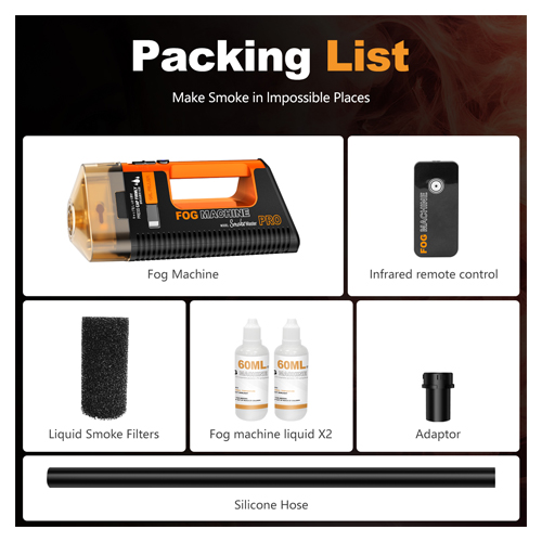 El paquete incluye la máquina de humo Lensgo Smoke Master Pro, un cable de carga USB-C y un set de inicio con aceite, para que puedas comenzar a crear ambientes envolventes y cinematográficos desde el primer momento.