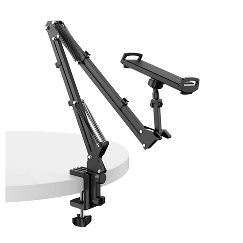 Pedestal articulado de 40 cm de largo, construido en metal en dos secciones, y con base metálica con insertos de caucho para proteger la superficie de sujeción. Cuenta con un portacelular capaz de sujetar hasta 2kg de peso y un dispositivo de hasta 28 cm