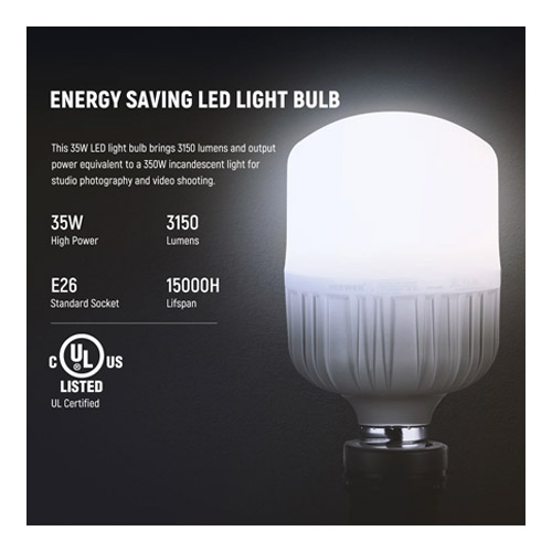La bombilla LED de 35 vatios, certificada por UL, ofrece una iluminación potente y estable, con una salida de 3450 lúmenes, equivalente a una bombilla incandescente de 350 W. Con una temperatura de color de 5700 K, proporciona una luz blanca neutra ideal para fotografía de estudio y grabaciones de video, sin parpadeos ni fluctuaciones.
