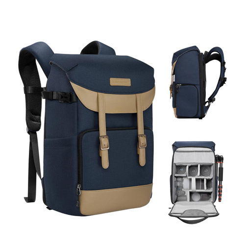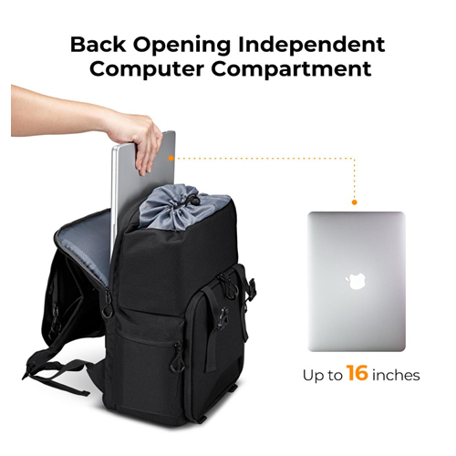 Esta mochila fotográfica ofrece una gran capacidad, con espacio para una cámara y hasta cuatro objetivos, además de un compartimento independiente para un portátil de 15,6”. Sus dimensiones son 30 × 21 × 44 cm. Está fabricada con materiales impermeables y cuenta con un frontal rígido de EVA, mientras que el interior acolchado absorbe impactos para proteger el equipo incluso en condiciones exigentes. Su diseño incorpora múltiples bolsillos internos y externos que permiten organizar fácilmente tarjetas SD, baterías, cables, trípodes y otros accesorios esenciales. La estructura está dividida en dos compartimentos, superior e inferior, para separar el equipo fotográfico de los objetos personales, ideal tanto para uso urbano como para viajes. Para mayor comodidad, incluye respaldo acolchado con ventilación, correas ajustables y una banda trasera para sujetarla a una maleta. También viene con una funda impermeable extraíble para protegerla de la lluvia, el polvo o el barro.