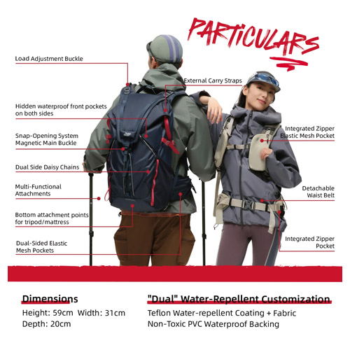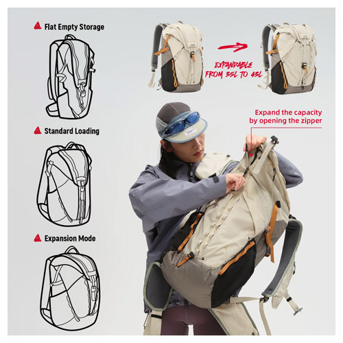 El interior se puede personalizar libremente para adaptarse a sus necesidades, lo que le permite elegir diferentes modos de carga. Perfecto para fotografía, senderismo, acampada y viajes. Con un sistema de expansión único, 25L se puede ampliar a 33L, y 35L se puede ampliar a 43L.