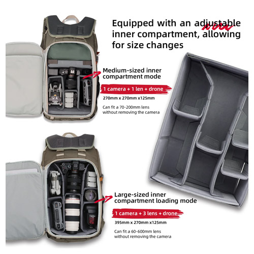 Esta mochila de fotografía cuenta con un forro interior plegable que ofrece una función de “expandir y contraer”. Con el separador medio cargado, la mochila se transforma en un modo de fotografía al aire libre, acomodando la mitad del equipo de fotografía y la otra mitad acomodando el equipo para exteriores. Si esta completamente cargada, se convierte en una bolsa para cámara de alta capacidad. Sin el forro interior, sirve como una bolsa para exteriores. Cuando está vacía, la bolsa se puede comprimir a un grosor de solo 2 cm, lo que facilita su almacenamiento sin ocupar espacio. Adopta un revestimiento repelente al agua de teflón y un adhesivo impermeable de PVC de tela que protege bien la cámara.