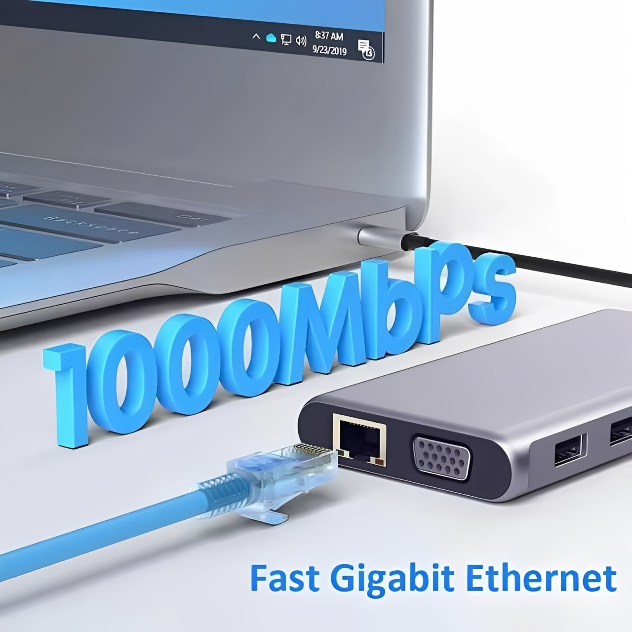 Estación de expansión USB-C 12 en 1 diseñada para maximizar la conectividad de tu laptop, tablet o smartphone con puerto USB-C. Convierte un único puerto USB-C en múltiples interfaces esenciales como dos salidas HDMI 4K, VGA, Ethernet Gigabit, lector de tarjetas SD/TF, audio, 4 puertos USB3.0 y más, haciendo de este hub una solución perfecta para trabajo, oficina, presentaciones y entretenimiento multimedia.