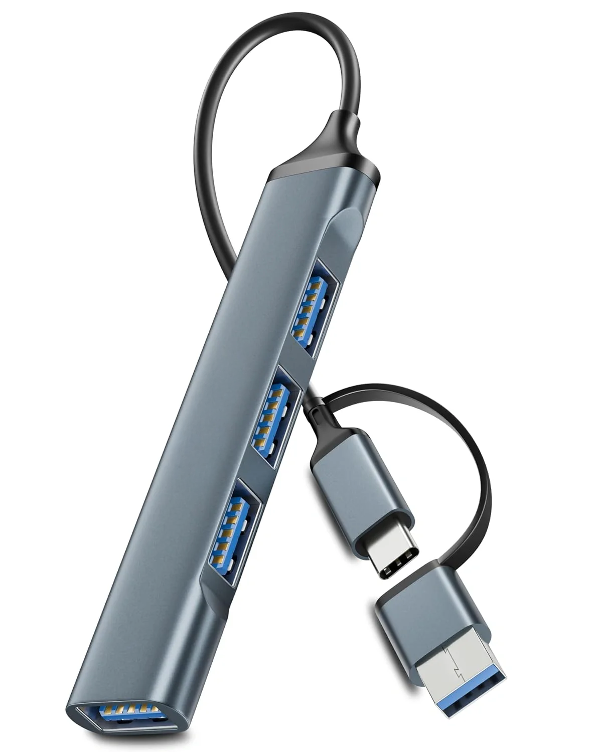 El hub USB-C 4 en 1 es un adaptador compacto y funcional diseñado para ampliar la conectividad de laptops, tablets y dispositivos modernos con puerto USB-C. Convierte un solo puerto USB-C en cuatro puertos USB-A, permitiendo conectar múltiples periféricos de forma simultánea.