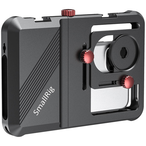 Jaula porta celular SmallRig CPU2494 para celulares desde 2.5” (6.35cm) a 3.4” (8.6cm) de ancho, con adaptador de filtros y lentes de 37mm, dos zapatas frías, roscas de 1/4″ para accesorios, perforaciones para cable de carga, adaptador de correa de mano, etc.