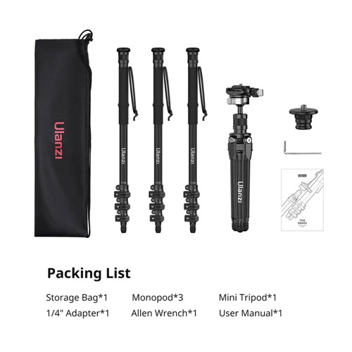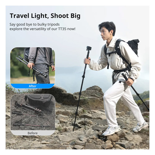 El TT35 consta de tres monopies y un mini trípode, que se puede transformar rápidamente en un trípode estable con una altura máxima de 145 cm, asegurando cada toma. Fabricado con aleación de aluminio de calidad y fibra de carbono, este trípode es liviano pero increíblemente resistente para soportar hasta 5 kg, y tiene un peso aproximado de 1,16 kg.