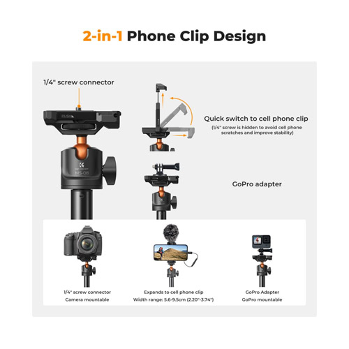 Compatibilidad versátil: Con una interfaz de 1/4 de pulgada, es compatible con una variedad de dispositivos y soporta hasta 3 kg, incluidos cámaras sin espejo, smartphones y más.