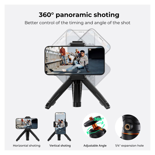 La interfaz de 1/4 de pulgada en la parte superior es compatible con varios dispositivos, permitiendo un montaje seguro. El tubo del trípode cuenta con un anillo de goma amortiguador incorporado, lo que mejora la estabilidad y resistencia del sistema. Además, tiene una estructura ensanchada y una almohadilla de silicona antideslizante en la base para mayor estabilidad. Con un peso de solo 97 g, es fácil de transportar y perfecto para viajes y tomas al aire libre.
