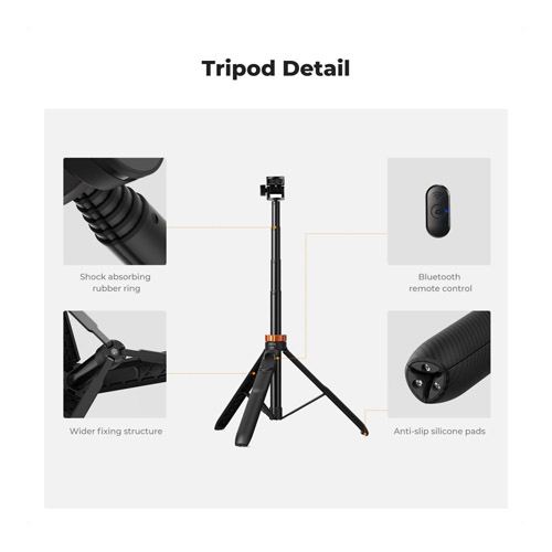 Este soporte de luz ha sido diseñado con una base más ancha y estable, incorporando almohadillas de silicona antideslizante en la parte inferior que garantizan firmeza y evitan deslizamientos. Además, el tubo de las patas cuenta con anillos de goma amortiguadores que refuerzan la estabilidad y rigidez del conjunto. Su estructura portátil de una sola pieza y diseño telescópico de 8 secciones permite ajustar la altura hasta un máximo de 175 cm, mientras que su tamaño plegado de solo 33 cm lo hace compacto y fácil de transportar en una mochila. En la parte superior, incluye un conector estándar de 1/4″, compatible con una amplia variedad de accesorios fotográficos como luces COB, luces de anillo, luces de bolsillo y más. También viene equipado con un clip para teléfono móvil y un adaptador para cámara deportiva de accion tipo GoPro, permitiendo su uso con distintos dispositivos. Este mini trípode soporta hasta 1 kg y ofrece una inclinación vertical de ±90°, ideal para capturar imágenes desde múltiples ángulos, ya sea en paisajes, retratos o escenas deportivas. Como valor añadido, incluye un control remoto Bluetooth independiente, perfecto para selfies o grabaciones en viajes, con funcionamiento continuo de hasta 10 horas y un diseño práctico que evita su pérdida.