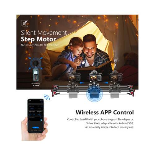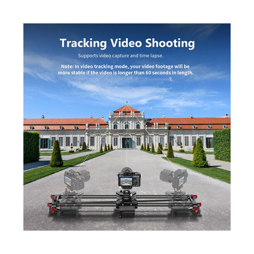La aplicación ofrece múltiples modos creativos, como panorámicas de hasta 120°, time-lapse, seguimiento de sujetos y un modo de ida y vuelta continuo. Además, el carro incluye roscas inferiores de 1/4″-20 y 3/8″-16 para una fácil instalación en trípodes, así como un tornillo de 1/4″-20 para el montaje de cámaras o cabezales. El kit se completa con una batería reemplazable de la serie L de 1000 mAh, un cargador, una rótula y seis cables disparadores compatibles con distintas cámaras, optimizando su uso en modos automatizados.