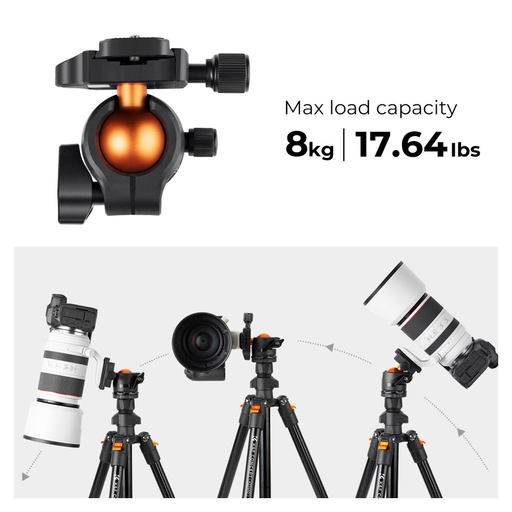 La rótula de bola(Diámetro: 28mm) se carga máxima de 8kg, y se puede girar a cualquier ángulo que desee, ayudando a ampliar el rango de fotografía durante el disparo panorámico. La placa de liberación rápida es compacta, ligera y rápida, puede adaptarse a la mayoría de las cámaras, DSLR etc. Como Nikon, Canon, Sony, Olympus Panasonic Pentax, etc.