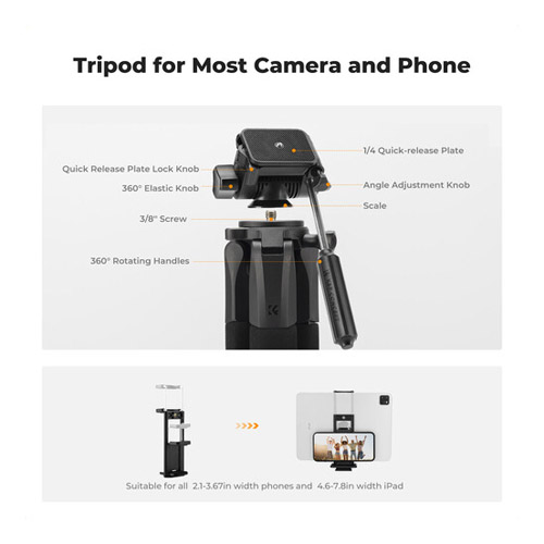 El trípode Vlog S255A3 de 5 secciones de K&F Concept es un sistema liviano y portátil, adecuado para una amplia gama de cámaras. Su columna central se ajusta fácilmente, permitiendo variar la altura entre 18,8 y 74,8″. Con una capacidad de carga de hasta 8,8 lb, el trípode incluye un cabezal con asa práctica para realizar ajustes suaves y precisos. Las patas se extienden liberando los cierres abatibles, y el trípode se pliega hasta alcanzar 50 cm de longitud para facilitar su transporte. Además, K&F Concept proporciona accesorios útiles, como dos placas de liberación rápida, un soporte para teléfono y una bolsa de almacenamiento y transporte.